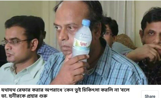 এখন সেই মুনীর কে তার সন্তান অথবা ভাতিজা অথবা ছোট ভাই এর বয়সী কতগুলো অসভ্য, অশিক্ষিত, বর্বর তারই কর্মক্ষেত্রে তারই অফিসকক্ষে ঢুকে প্রহার করেছে। আমরা প্রতিবাদ হিসেবে এক ঘন্টা কর্মবিরতি পালন করেছি আর মানব বন্ধন করেছি। ধিক্ আমাদের। আজ মুনীর কে মেরেছে, কাল আমাকে মারবে, নিশ্চিত থাকুন হে প্রিয় সংগ্রামী চিকিৎসক নেতা, পরশু কিন্তু আপনাকেও মারবে। তখনো কিন্তু আমরা জ্ঞান চর্চা করব, আর করব নিজেদের মধ্যে মারামারি, কাদা ছোড়াছুড়ি।