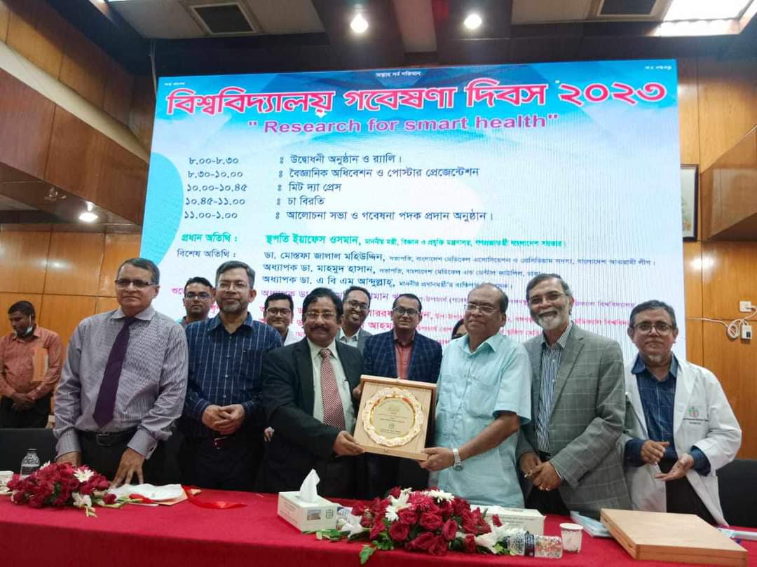 বঙ্গবন্ধু শেখ মুজিব মেডিক্যাল বিশ্ববিদ্যালয়ে (বিএসএমএমইউ) ৫ম বিশ্ববিদ্যালয় গবেষণা দিবস-২০২৩ নানা আয়োজনে পালিত হয়েছে। মঙ্গলবার ৩১ অক্টোবর ২০২৩ইং তারিখে দিবসটি উপলক্ষ্যে একটি বর্ণাঢ্য শোভাযাত্রা, গবেষণা পোস্টারিং, ওরাল প্রেজেন্টেশন, বৈজ্ঞানিক অধিবেশন, রিসার্চ ক্য়ুইজ, গবেষণা এ্যাওয়ার্ড, ভাইস চ্যান্সেলর রিসার্চ এ্যাওয়ার্ড, বেস্ট থিথিস এ্যাওয়ার্ড, রিসার্চ গ্রান্ট প্রদান, গবেষণা পদক প্রদান ও আলোচনা সভা আয়োজনের মাধ্যমে দিবসটি পালন করে বিশ্ববিদ্যালয়। বর্ণাঢ্য শোভাযাত্রাটি বিশ্ববিদ্যালয়ের বি ব্লকের সামনে শেখ রাসেল ফোয়ারা থেকে শুরু হয়ে ২নং গেট, ৩ নং গেট পার হয়ে কেবিন ব্লক প্রদক্ষিণ করে সি ব্লকের সামনে গিয়ে শেষ হয়। এরপর সকাল সাড়ে ৮টা হতে শহীদ ডা. মিলন হলে বৈজ্ঞানিক অধিবেশন ও পোস্টার প্রেজেন্টেশনে অংশগ্রহণ করেন বিশ্ববিদ্যালয়ের বিভিন্ন বিভাগের চিকিৎসক গবেষকগণ। বৈজ্ঞানিক অধিবেশনে ১০টি ওরাল প্রেজেন্টেশন এবং ২০টি পোস্টার প্রেজেন্টেশন করা হয়। দিবসটি উপলক্ষে বিশেষ স্যুভেনির প্রকাশিত হয়। অনুষ্ঠানে প্রধান অতিথি হিসেবে উপস্থিত ছিলেন বাংলাদেশ আওয়ামী লীগের প্রেসিডিয়াম সদস্য ও বাংলাদেশ মেডিক্যাল এসোসিয়েশনের সভাপতি ডা. মোস্তফা জালাল মহিউদ্দিন। এ সকল কর্মসূচীতে সভাপতিত্ব করেন বঙ্গবন্ধু শেখ মুজিব মেডিক্যাল বিশ্ববিদ্যালয়ের উপাচার্য অধ্যাপক ডা. মোঃ শারফুদ্দিন আহমেদ। বিশেষ অতিথি হিসেবে উপস্থিত ছিলেন মাননীয় প্রধানমন্ত্রীর ব্যক্তিগত চিকিৎসক ইমেরিটাস অধ্যাপক ডা. এবিএম আব্দুল্লাহ। স্বাগত ও শুভেচ্ছা বক্তব্য রাখেন উপ-উপাচার্য (গবেষণা ও উন্নয়ন) অধ্যাপক ডা. মোঃ মনিরুজ্জামান খান।