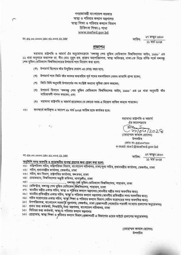 ঙ. মহামান্য রাষ্ট্রপতি ও আচার্য প্রয়োজনে যেকোনো সময় এ নিয়োগ বাতিল করতে পারবেন। জনস্বার্থে জারি করা এ আদেশ ২৯ মার্চ ২০২৪ তারিখ হতে কার্যকর হবে।