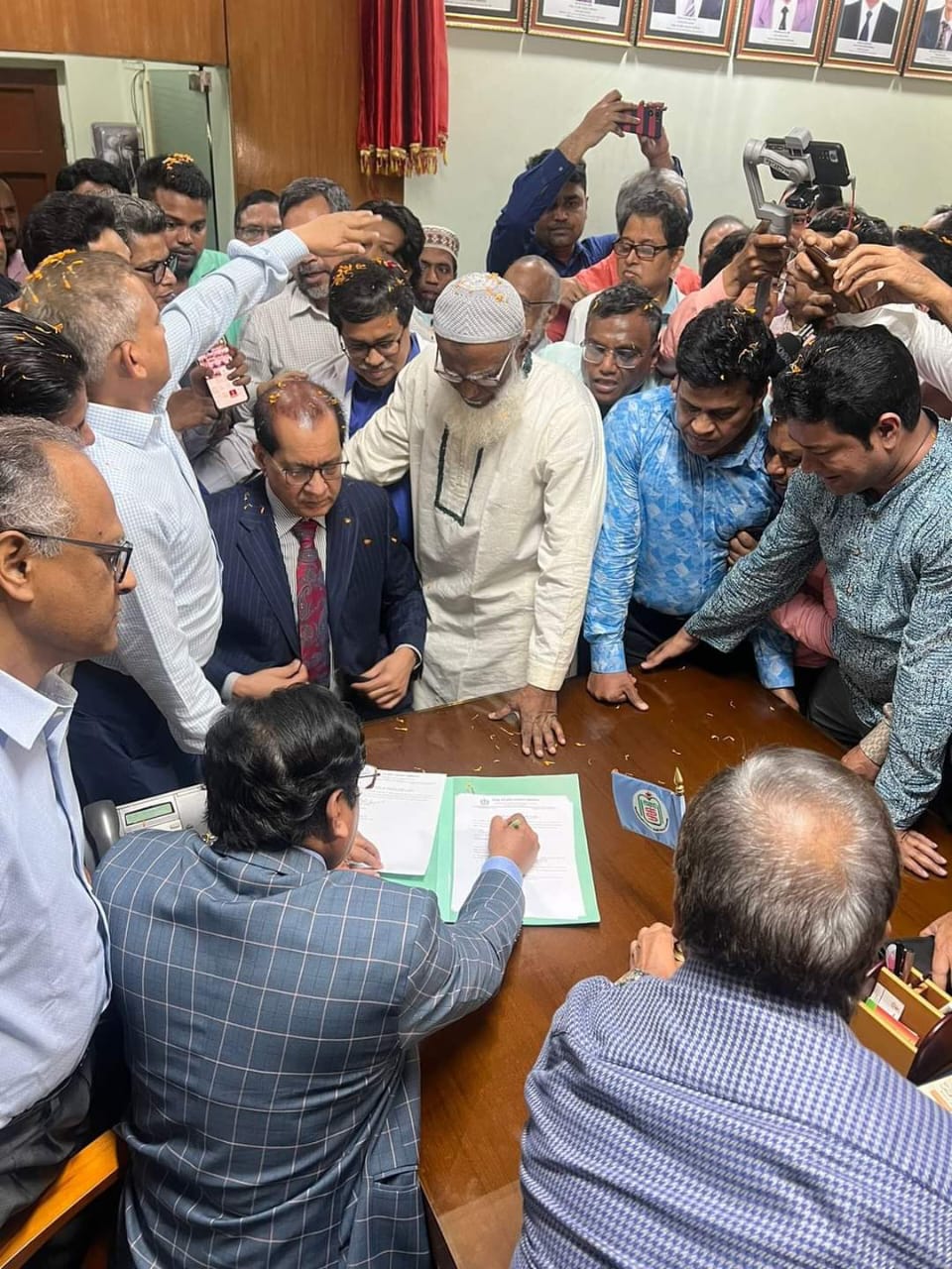 আজ এক ঐতিহাসিক মুহূর্তের সাক্ষী হয়ে গেলাম। দেখলাম এক শিক্ষকের বিদায় ও অন্য শিক্ষকের দায়িত্ব গ্রহণ। দু'জনেই স্বনামধন্য প্রতিথযশা চক্ষু বিশেষজ্ঞ। একজন বঙ্গবন্ধু শেখ মুজিব মেডিকেল বিশ্ববিদ্যালয়ের বিদায়ী উপাচার্য অধ্যাপক মোঃ শারফুদ্দিন আহমেদ, অন্যজন সদ্য দায়িত্বপ্রাপ্ত অধ্যাপক দীন মোহাম্মদ নূরুল হক। অত্যন্ত আন্তরিক পরিবেশে ফুলেল শুভেচ্ছা জানিয়ে দীন মোহাম্মদ স্যারের কাছে দায়িত্ব হস্তান্তর করলেন অধ্যাপক মোঃ শারফুদ্দিন আহমেদ। আক্ষরিক অর্থেই নবীন উপাচার্যকে হাত ধরে চেয়ারে বসিয়ে দিলেন। দীন মোহাম্মদ স্যার কাজ শুরু করলেন বঙ্গবন্ধুর প্রতিকৃতিতে পুষ্পস্তবক অর্পণ করে। শারফুদ্দিন স্যারও বিদায় নিলেন বঙ্গবন্ধুর প্রতিকৃতে পুষ্পার্ঘ্য নিবেদন করে। দুজনেই আমার সরাসরি শিক্ষক। দীন মোহাম্মদ স্যার তো সেই ১৯৮৫-৮৬ সালে আমাদের অ্যানাটমি পড়াতেন। পরে এই দুজনের পদাঙ্ক অনুসরণ করে নিজেও চক্ষু বিশেষজ্ঞ হিসাবে প্রতিষ্ঠিত হওয়ার প্রয়াস পেলাম। সব পোষ্ট গ্র্যাজুয়েশন ও ফেলোশিপ শেষ করে বাংলাদেশ চক্ষু চিকিৎসক সমিতিতে ধীরে ধীরে কাজ শুরু করলাম ২০০৮ সালে। পরবর্তী বছরে সভাপতি নির্বাচিত হলেন অধ্যাপক দীন মোহাম্মদ নূরুল হক। তাঁর কার্যকরী পরিষদে আমি ছিলাম একজন সদস্য। এর পর থেকে এ পর্যন্ত প্রতিটি কার্যকরী পরিষদে বিভিন্ন পদে নির্বাচিত হবার সৌভাগ্য আমার হয়েছে। অধ্যাপক শারফুদ্দিন আহমেদ বাংলাদেশ চক্ষু চিকিৎসক সমিতির সভাপতি ছিলেন টানা ছয় বছর। তাঁর কার্যকরী পরিষদে আমি সর্বশেষ ছিলাম কোষাধ্যক্ষ হিসাবে। এর পরের বছর আমি যখন মহাসচিব নির্বাচিত হই তখন শারফুদ্দিন স্যার সভাপতির দায়িত্ব ছেড়ে দিয়েছেন, আমাদের আরেক প্রবীণ শিক্ষক অধ্যাপক এ কে এম এ মুকতাদির হলেন আমার সভাপতি।