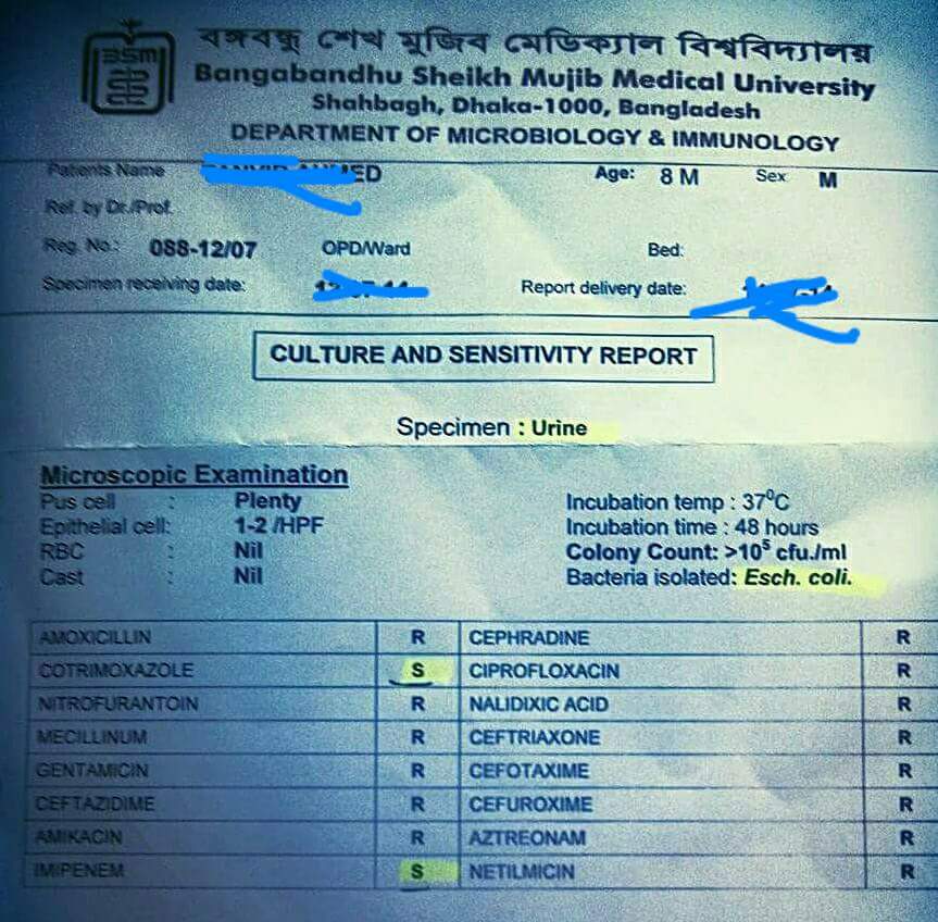আট মাসের এক বাচ্চার প্রস্রাব পরীক্ষার রিপোর্ট। । এখানে দেখা যাচ্ছে - বাচ্চার শরীরে এক গাদা এন্টিবায়োটিকের মধ্যে মাত্র দুইটা এন্টিবায়োটিক কার্যকর। । বাকী গুলোর শরীরে রেজিস্ট্যান্ট বা অকার্যকর। ।