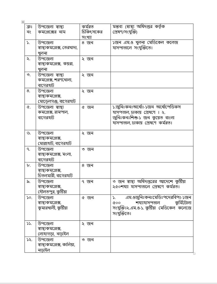 উপর্যূক্ত বিষয়ের আলোকে জানানো যাচ্ছে যে, খুলনা বিভাগের আওতাধীন নিম্নবর্ণিত উপজেলা স্বাস্থ্য কমপ্লেক্সে ৩জন বা তারচেয়ে কম চিকিৎসক কর্মরত আছে। সেই সকল উপজেলা স্বাস্থ্য কমপ্লেক্সের নামের তালিকা প্রদত্ত ‘ছক’ মোতাবেক আপনার অবগতি ও প্রয়োজনীয় ব্যবস্থা গ্রহণের জন্য প্রেরণ করা হল। ৩ জন বা তার চেয়ে কম সংখ্যক চিকিৎসক দিয়ে একটি উপজেলা স্বাস্থ্য কমপ্লেক্স পরিচালনা করা কতটা অবাস্তব, কষ্টসাধ্য ও ঝুঁকিপূর্ণ তা আপনি জ্ঞাত আছেন। নারী চিকিৎসকদের জরুরি বিভাগসহ লাগাতর ১৬ ঘণ্টা দায়িত্ব পালন করতে হয়। তখন তাদের নিরাপত্তার প্রশ্নে কি ভয়াবহ অবস্থার সৃষ্টি হয় তা আপনার অজানা নয়। কোন কোন চিকিৎসককে বিরতিহীনভাবে ২৪ ঘন্টা দায়িত্ব পালন করতে হচ্ছে। প্রশাসন ও জনগনের কাছে লাঞ্চিত হওয়ার ভয়ে চিকিৎসকরা নীরব আছে। যে কোন সময় ঝুঁকিপূর্ণ অবস্থায় শারীরিকভাবে চিকিৎসক লাঞ্চিত হওয়ার ঘটনা ঘটতে পারে। ঠিক তখনই বিস্ফোরন ঘটবে।