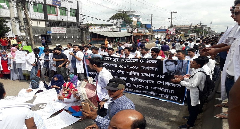 বাসের ধাক্কায় গাজীপুরের তায়রুন্নেছা মেডিকেল কলেজ হাসপাতাল কর্মরত চিকিৎসক শামির শাকির প্রকাশ (২৮) নিহত হওয়ার ঘটনায় চালককে গ্রেপ্তার করে বিচারসহ তিন দফা দাবিতে ঢাকা-ময়মনসিংহ সড়কে প্রতিবাদ কর্মসূচি করেছে শিক্ষার্থীরা।