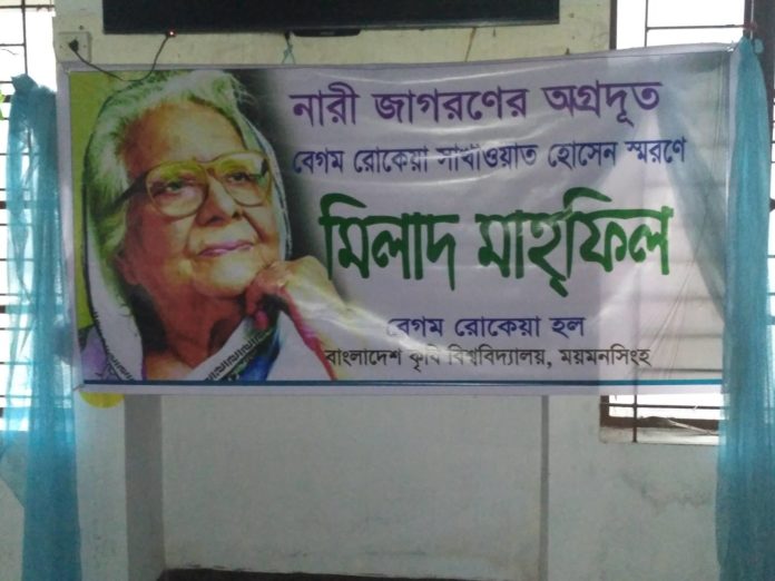 এরই ধারাবাহিকতায় ময়মনসিংহের বাংলাদেশ কৃষি বিদ্যালয়েও পালিত হয় দিবসটি। তবে বিশ্ববিদ্যালয়ের যে আবাসিক হলটি খোদ বেগম রোকেয়ার নামানুসারে সেই হলের আয়োজনে ঘটেছে হতবাক করা কান্ড। বেগম রোকেয়াকে স্মরণ করতে গিয়ে আয়োজিত মিলাদ মাহফিলের ব্যানারে বাংগালীর আরেক অহংকার নারী জাগরনের আরেক কিংবদন্তী কবি সুফিয়া কামালের ছবি দেয়া হয়েছে।