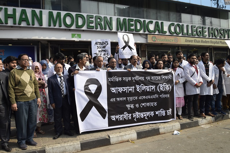 আনোয়ার খান মডার্ণ মেডিকেল কলেজের শিক্ষার্থী আফসানা ইতি নিহতের ঘটনায় বিক্ষোভ ও মানববন্ধন করেছেন প্রতিষ্ঠানটির শিক্ষক-শিক্ষার্থীরা। ২০ জানুয়ারি দুপুর বারোটার দিকে ধানমন্ডিতে প্রতিষ্ঠানটির সামনে আধা ঘণ্টা বিক্ষোভ করেন তারা।