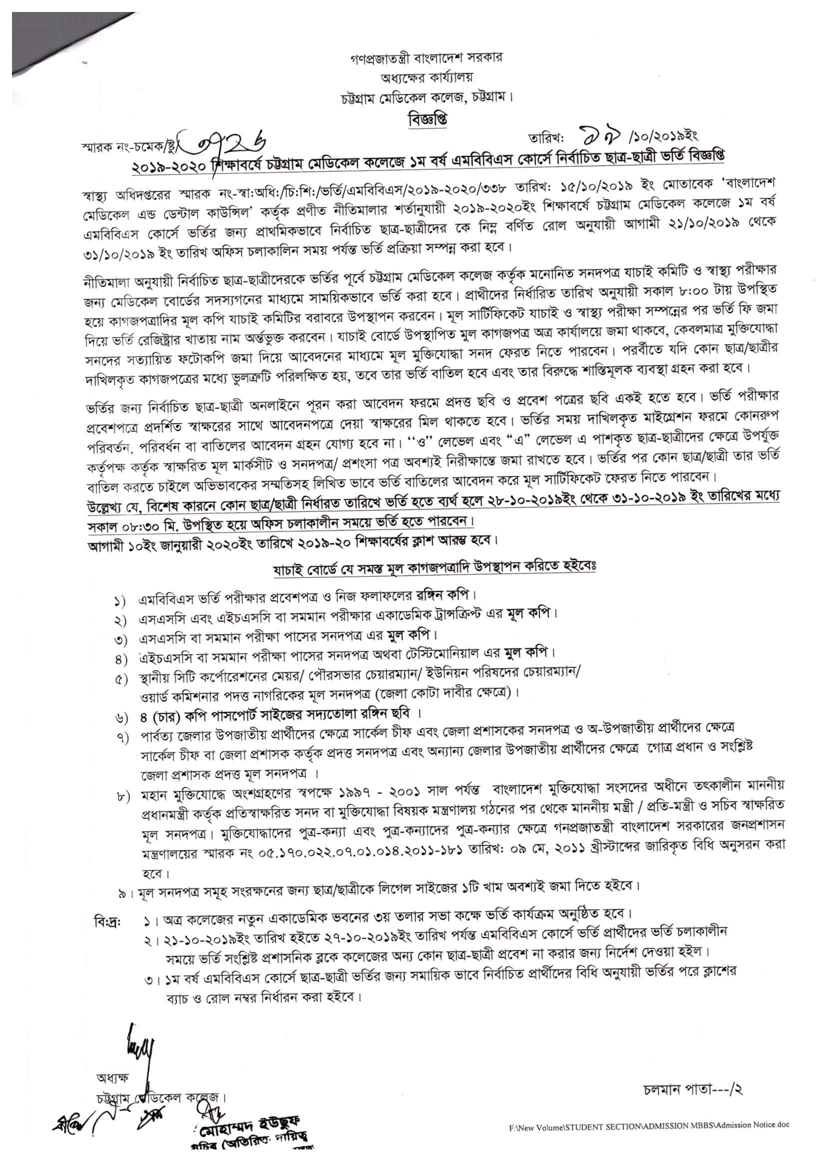 ২০১৯-২০ শিক্ষাবর্ষে চট্টগ্রাম মেডিকেল কলেজে এমবিবিএস কোর্সে নির্বাচিত ছাত্র-ছাত্রী ভর্তি সংক্রান্ত প্রেস বিজ্ঞপ্তি প্রকাশ করা হয়েছে।