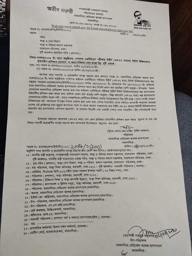 আপাতত: ইন্টার্নশিপে যোগ না দেয়ায় কথা বলেছিলেন। তাদের ব্যাপারে এ সিদ্ধান্ত নেয়া হয়েছে ; ময়মনসিংহ মেডিকেল কলেজ হাসপাতালের পরিচালক ব্রিগেডিয়ার জেনারেল ডা. মো. নাসির উদ্দীন আহমেদ তার ফেসবুক পেজে এক বিস্তারিত লেখায় এ তথ্য ও এ নিয়ে আত্মকৈফিয়ত তুলে ধরেন।