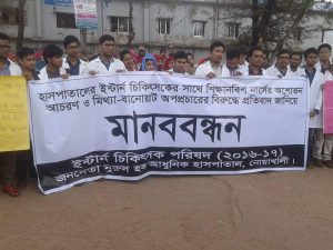 নোয়াখালী হাসপাতালে অশোভন আচরনের প্রতিবাদে ইন্টার্ন ডাক্তারদের মানববন্ধন