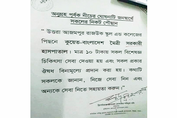 অবিশ্বাস্য হলেও সত্য, বাংলাদেশের রাজধানী ঢাকার একটি সরকারি হাসপাতালে মাত্র ১০ টাকায় বিশ্ব মানের চিকিৎসা। এখানে চেন্নাই , ব্যাঙ্গালুরু, সিঙ্গাপুর , মালয়েশিয়া মানের সুন্দর পরিবেশ। ডাক্তারদের অনন্য অনবদ্য ব্যবহার। যারা একবার চিকিৎসা নিয়েছেন , তারা নিয়ে যাচ্ছেন আত্মীয় স্বজনকেও। হাসপাতালটি উত্তরা। নাম মৈত্রী হাসপাতাল। এটি কুয়েতি অনুদানে নির্মিত বলে নাম: বাংলাদেশ কুয়েত মৈত্রী সরকারি হাসপাতাল। কিন্তু পুরোটাই এখন বাংলাদেশ সরকারের পরিচালনায় চলে। এখানে মাত্র ১০ টাকায় উন্নত বিশেষজ্ঞ চিকিৎসা দেওয়া হয় এবং ওষুধ নিয়মানুযায়ী যথাসাধ্য বিনামূল্যে দেয়া হয়।