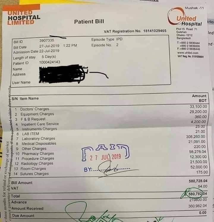 রোগীর চিকিৎসার বিলের কপিতে দেখা গেছে, ৫ দিনে ল্যাব চার্জ বাবদ ধরা হয়েছে ৩ লাখ ৮ হাজার ২ শত ৬০ টাকা, ডাক্তারের ফি বাবদ ৩৩ হাজার ১ শত টাকা, ওষুধ বাবদ ৯৮ হাজার ২ শত ৭৬ টাকা, রুম চার্জ ৫২০০০ টাকা, সরঞ্জাম বাবদ চার্জ ২৯ হাজার ২ শত টাকা, রেডিওলজি চার্জ ২১ হাজার ৫ শত টাকা, মেডিকেল ডিসপোজেবলস বাবদ ২১ হাজার ৯১ টাকা, প্রসিডিউর চার্জ ১২ হাজার ৩ শত টাকা, এফ এন্ড বি রিকুয়েস্ট ৩ শত ৬০ টাকা, সাটারস চার্জ ১ শত ৭৫ টাকা, ইন্ট্রুমেন্ট চার্জ ২৫ টাকা, ল্যাব আইটেম বাবদ ২১ টাকা, অন্যান্য ২ শত ২০ টাকা এবং ভ্যাট বাবদ ৫৪ টাকা।