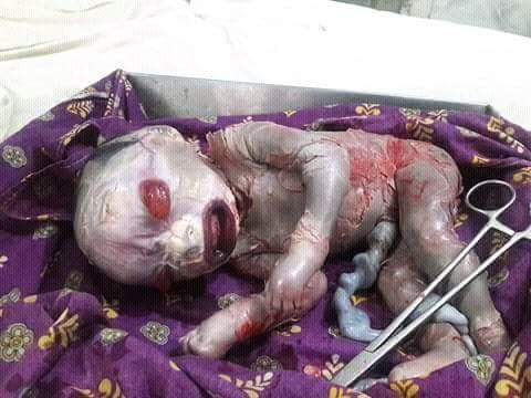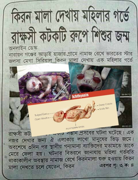 বাচ্চাটার রোগের নাম - Harlequin Icthyosis ... এটা জন্মগত রোগ।।এই রোগের ক্লিনিক্যাল সিম্পটম হলো fissured armor-plate hyperkeratosis ... প্রতি 300000 বাচ্চার মধ্যে একজন বাচ্চার এমন রোগ হতে পারে।। চামড়ার উপর আরেকটা লেয়ার থাকে।। দেখতে অস্বাভাবিক লাগে তাই দেখতে।। ভূত প্রেত কিছু না।। অন্যান্য জন্মগত রোগের মত, Harlequin Icthyosis ও একটা রোগ।।