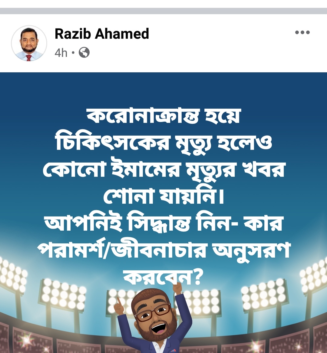 এ বিষয়ে তুলনামূলক চিত্র তুলে ধরে তিনি বলেন,""করোনাক্রান্ত হয়ে চিকিৎসকের মৃত্যু হলেও কোনো ইমামের মৃত্যুর খবর শোনা যায়নি।