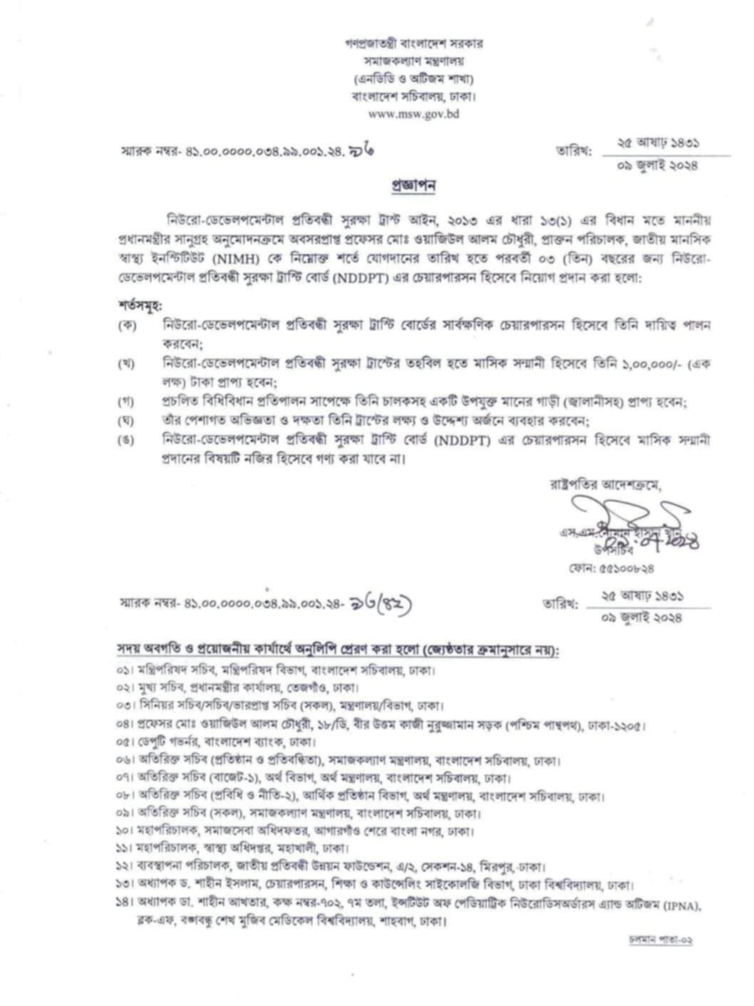 অধ্যাপক ডা.মো. ওয়াজিউল আলম চৌধুরী এনডিডিপি ট্রাস্ট এর চেয়ারপারসন হিসেবে নিয়োগ পেয়েছেন।