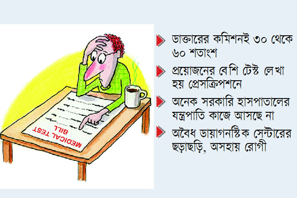 সরকারি অনুমোদন ছাড়াই দেশজুড়ে ডায়াগনস্টিক সেন্টার, প্যাথলজি ব্যবসার ছড়াছড়ি। সাইনবোর্ডসর্বস্ব এসব প্রতিষ্ঠানে হাতুড়ে টেকনিশিয়ান দিয়েই চলে রোগ নির্ণয়ের সব পরীক্ষা। তারা মনগড়া রিপোর্ট তৈরি করে অহরহ ঠকাচ্ছে নিরীহ মানুষকে। একই রোগ পরীক্ষায় একেকটি ডায়াগনস্টিক সেন্টার থেকে একেক রকম রিপোর্ট পাওয়ার অসংখ্য নজির রয়েছে। পুরুষের পরীক্ষা রিপোর্টে তুলে ধরা হয় মেয়েলি রোগের বিবরণ। আবার উল্টো চিত্রও আছে। এসব রিপোর্ট নিয়ে রোগী ও তাদের স্বজনরা চরম বিভ্রান্তিতে পড়েন। তা সত্ত্বেও সরকারি হাসপাতালের একশ্রেণির ডাক্তারের সহায়তায় ডায়াগনস্টিক সেন্টার মালিকদের যথেচ্ছ টেস্টবাণিজ্য চলছে বছরের পর বছর। অভিযোগ তুলেও এসবের প্রতিকার মিলছে না।