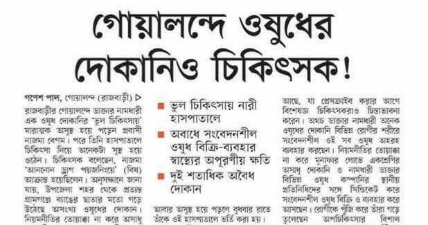 রাজবাড়ীর গোয়ালন্দে ডাক্তার নামধারী এক ওষুধ দোকানির ‘ভুল চিকিৎসায়’ মারাত্মক অসুস্থ হয়ে পড়েন প্রবাসী নাজমা বেগম। পরে তিনি হাসপাতালে চিকিৎসা নিয়ে অনেকটা সুস্থ হয়ে ওঠেন। চিকিৎসক বলেছেন, নাজমা ‘আননোন ড্রাগ পয়জনিংয়ে’ (বিষ) আক্রান্ত হয়েছিলেন। অনুসন্ধানে জানা যায়, উপজেলা শহর থেকে প্রত্যন্ত গ্রামগঞ্জে ব্যাঙের ছাতার মতো গড়ে উঠেছে অসংখ্য ওষুধের দোকান। নিয়মনীতির তোয়াক্কা না করে অসাধু দোকানিরা মুনাফার জন্য নিজেদের ‘ডাক্তার’ পরিচয় দিয়ে চিকিৎসার নামে অবাধে সংবেদনশীল ওষুধ বিক্রি ও ব্যবহার করে আসছেন। এতে রোগীদের বিশেষ করে শিশুস্বাস্থ্যের অপূরণীয় ক্ষতি হচ্ছে।