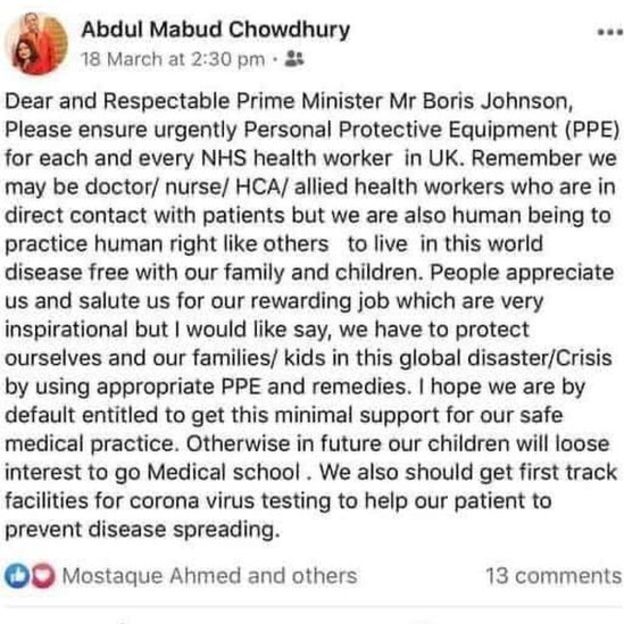 "প্রিয় প্রধানমন্ত্রী বরিস জনসন, দয়া করে ব্রিটেনে এনএইচএসের সমস্ত স্বাস্থ্যকর্মীর জন্য ব্যক্তিগত সুরক্ষার জিনিসপত্র নিশ্চিত করুন। মনে রাখবেন, আমরা হয়তো ডাক্তার/নার্স/স্বাস্থ্য সেবা কর্মী, যাদের প্রতিদিন সরাসরি রোগীদের সংস্পর্শে আসতে হয়, কিন্তু আমরাও মানুষ, আমাদেরও মানবাধিকার আছে। আমাদেরও অধিকার আছে এই পৃথিবীতে সন্তান এবং পরিবার পরিজন নিয়ে রোগমুক্তভাবে বেঁচে থাকার।"