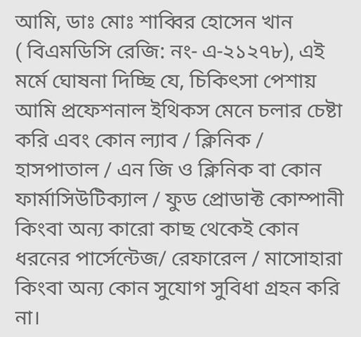 আমি, ডাঃ মোঃ শাব্বির হোসেন খান ( বিএমডিসি রেজি: নং- এ-২১২৭৮), এই মর্মে ঘোষনা দিচ্ছি যে, চিকিৎসা পেশায় আমি প্রফেশনাল ইথিকস মেনে চলার চেষ্টা করি এবং কোন ল্যাব / ক্লিনিক / হাসপাতাল / এন জি ও ক্লিনিক বা কোন ফার্মাসিউটিক্যাল / ফুড প্রোডাক্ট কোম্পানী কিংবা অন্য কারো কাছ থেকেই কোন ধরনের পার্সেন্টেজ/ রেফারেল / মাসোহারা কিংবা অন্য কোন সুযোগ সুবিধা গ্রহন করি না।