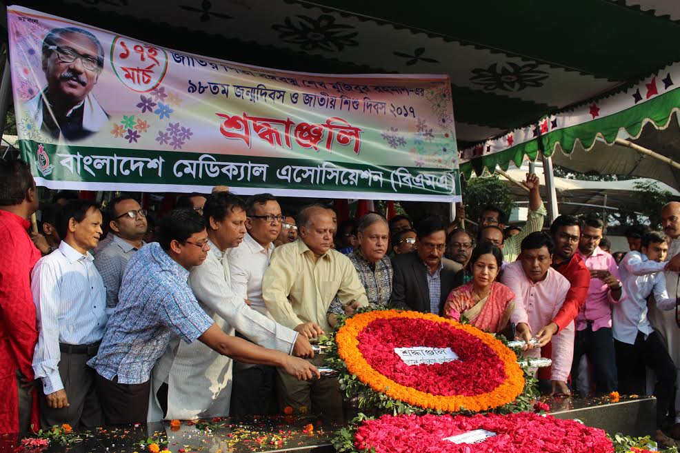 আজ ১৭ মার্চ। স্বাধীন বাংলাদেশের মহান স্থপতি জাতির পিতা বঙ্গবন্ধু শেখ মুজিবুর রহমান এর ৯৮তম শুভ জন্মদিন ও জাতীয় শিশু দিবস। বাংলাদেশ মেডিক্যাল এসোসিয়েশন যথাযোগ্য মর্যাদা ও উৎসাহ উদ্দীপনার মধ্য দিয়ে দিবসটি উদযাপন করেছে। বিএমএ সভাপতি ডা. মোস্তফা জালাল মহিউদ্দিন ও মহাসচিব ডা. মোঃ ইহতেশামুল হক চৌধুরীর নেতৃত্বে কেন্দ্রীয় কার্যকরী পরিষদের সদস্য, কেন্দ্রীয় কাউন্সিল সদস্যসহ ঢাকাস্থ বিভিন্ন ইনস্টিটিউট, হাসপাতাল ও মেডিকেল কলেজের চিকিৎসকগণ সকাল ৭:০০টায় ধানমন্ডি ৩২ নং সড়কে বঙ্গবন্ধুর প্রতিকৃতিতে শ্রদ্ধা নিবেদন করেন।