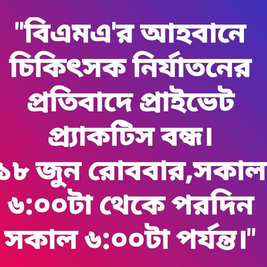 “সারাদেশে চিকিৎসক ও চিকিৎসা সেবা প্রতিষ্ঠানে হামলা ও ভাংচুরের প্রতিবাদে ও চিকিৎসকদের জন্য নিরাপদ কর্মস্থলের দাবীতে বাংলাদেশ মেডিক্যাল এসোসিয়েশন (বিএমএ) কেন্দ্রীয় কার্যকরী পরিষদ কর্তৃক পূর্ব ঘোষিত কর্মসূচি অনুযায়ী আগামী ১৮-০৬-২০১৭ খ্রিঃ তারিখ রবিবার সারাদেশে ২৪ ঘন্টা (১৮ জুন সকাল ০৬:০০টা থেকে ১৯ জুন সকাল ০৬:০০টা পর্যন্ত) প্রাইভেট প্র্যাকটিস বন্ধ থাকবে । উক্ত সময়ে সকল ধরনের জরুরী চিকিৎসা অব্যাহত থাকবে।