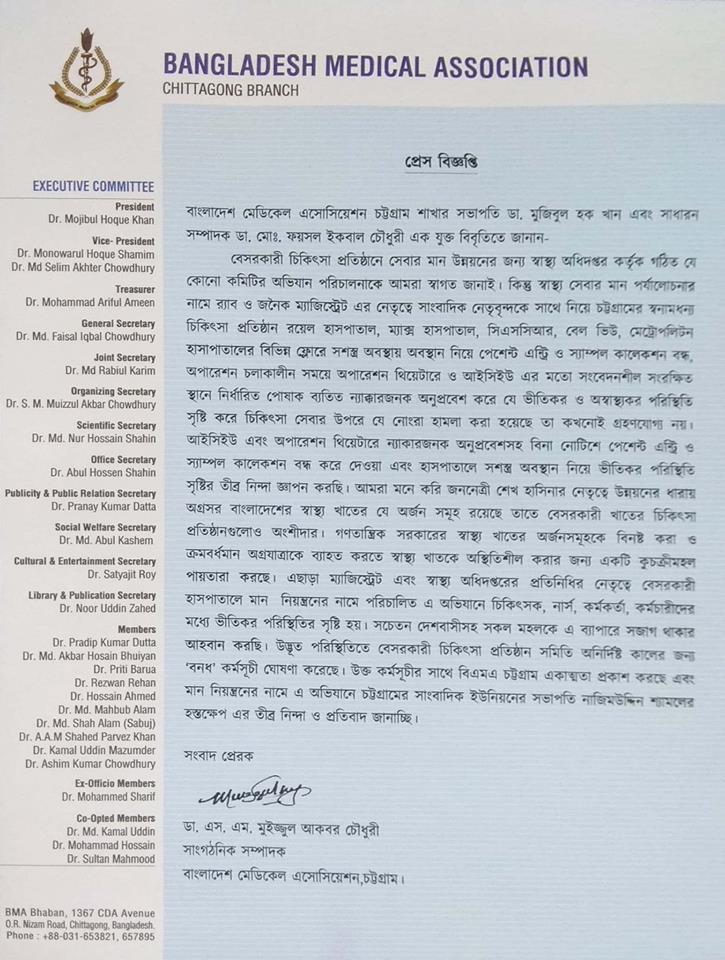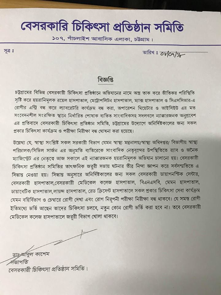 তাদের বক্তব্য, চট্টগ্রামের বিভিন্ন বেসরকারি চিকিৎসা প্রতিষ্ঠানে অস্ত্র তাক করে ভীতিকর পরিস্থিতি তৈরি করে হয়রানি মূলক রোগীর এন্ট্রি বন্ধ করে,ল্যাবরেটরি কার্যক্রম বন্ধ করে,অপারেশন থিয়েটার ও আইসিইউ এর মত সংবেদনশীল সংরক্ষিত স্থানে নির্ধারিত পোষাক ব্যতিত সাংবাদিক সহ সদলবলে ন্যাক্কারজনক অনুপ্রবেশ এর প্রতিবাদে বেসরকারী চিকিৎসা প্রতিষ্ঠান সমিতি, চট্টগ্রামের উদ্যোগে অনির্দিষ্টকালের জন্য সকল প্রকার চিকিৎসা কার্যক্রম ও পরীক্ষা নিরীক্ষা বন্ধ ঘোষণা করা হয়েছে ।