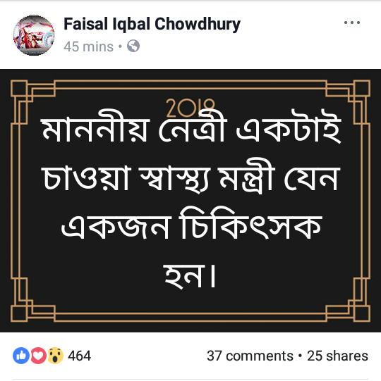 চট্টগ্রাম বিএমএর সাধারণ সম্পাদক, চিকিৎসক সমাজের পক্ষে প্রতিবাদী কন্ঠস্বর ডাক্তার নেতা ডা. ফয়সল ইকবাল চৌধুরী এবার আরেকটা যৌক্তিক দাবি নিয়ে আলোচনার ঝড় তুলেছেন। তার দাবি, স্বাস্থ্য মন্ত্রী যেন হয় একজন চিকিৎসক। তিনি দাবি জানান, "মাননীয় নেত্রী , একটাই চাওয়া , স্বাস্থ্য মন্ত্রী যেন একজন চিকিৎসক হন। "