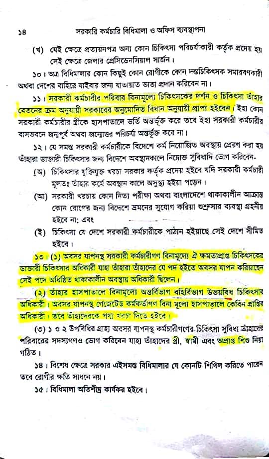 ১১। সরকারী কর্মচারীর পরিবার বিনামূল্যে চিকিৎসকের দর্শন ও চিকিৎসা তাহার বেতনক্রম অনুযায়ী সরকারের অনুমিত বিধান অনুযায়ী প্রাপ্য হইবেন।