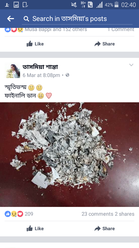 মার্চের পাঁচ তারিখে সে তার স্মৃতিকে ভস্ম করে ছাইয়ের ছবি আপ দিয়েছে ফেস বুকে।