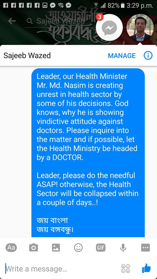 বাংলাদেশের স্বাস্থ্য ব্যবস্থার এই দুর্যোগ মুহুর্তে আজ কিছুক্ষণ আগে বাধ্য হয়ে তার কাছে পাঠানো আমার মেসেজটার স্ক্রীনশট দিলাম।